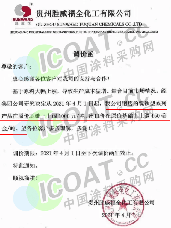 贵州胜威福全化工:从2021年4月1日起,锐钛型系列产品在原价基础上上调1000元/吨,出口价在原价基础上上调150美元/吨。
