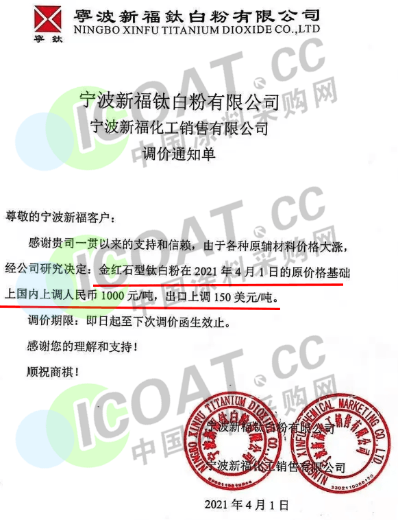 宁波新福:金红石型钛白粉在2021年4月1日的原价格基础上国内上调人民币1000元/吨,出口上调150美元/吨。