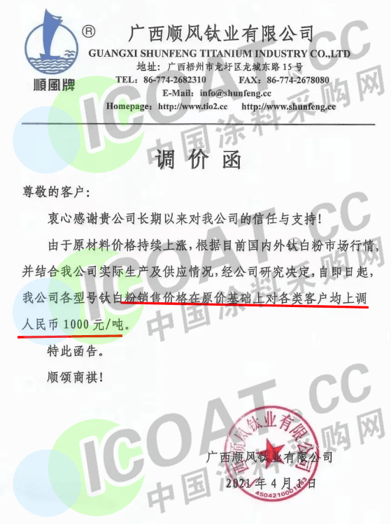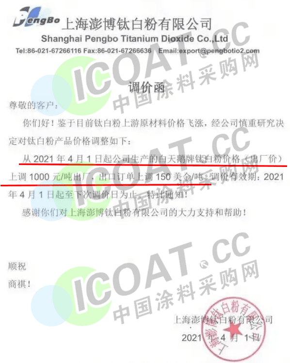 上海澎博钛白粉:从2021年4月1日起,公司生产的白天鹅牌钛白粉价格(出厂价)上调1000元/吨出厂,出口订单上调150美元/吨。