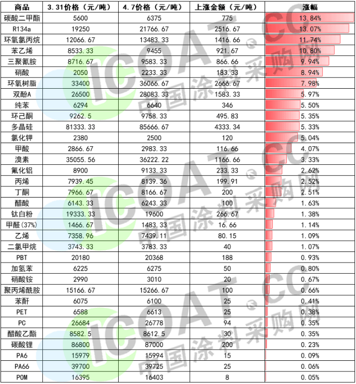 据涂料采购网了解,4月以来,安纳达、道恩钛业、东昊钛业、江苏镇钛、天原集团等众多钛白粉企业也在陆续发函调涨,短暂的小长假也没能阻止化工企业涨价的进度。除此之外,环氧树脂、双酚A、环氧氯丙烷、碳酸二甲酯等化工原材料也延续了一季度的涨势,丝毫没有停歇的意思。