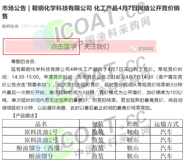 鞍钢化学科技有限公司:原料洗油、配油馏分等化工产品网上竞价。竞价模式为公开增价,加价梯度为10元/吨。