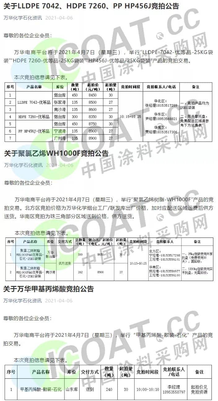 万华化学:LLDPE7042、HDPE7260、PP HP456J、聚氯乙烯、甲基丙烯酸等产品参与竞拍。起拍量为27-30吨左右,起拍价从8450-8900元/吨不等。