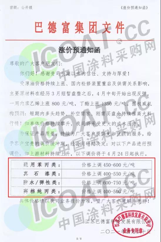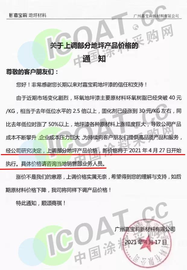 广州嘉宝莉新材料发函,称决定上调部分地坪产品价格,新价格将于4月27日开始执行。