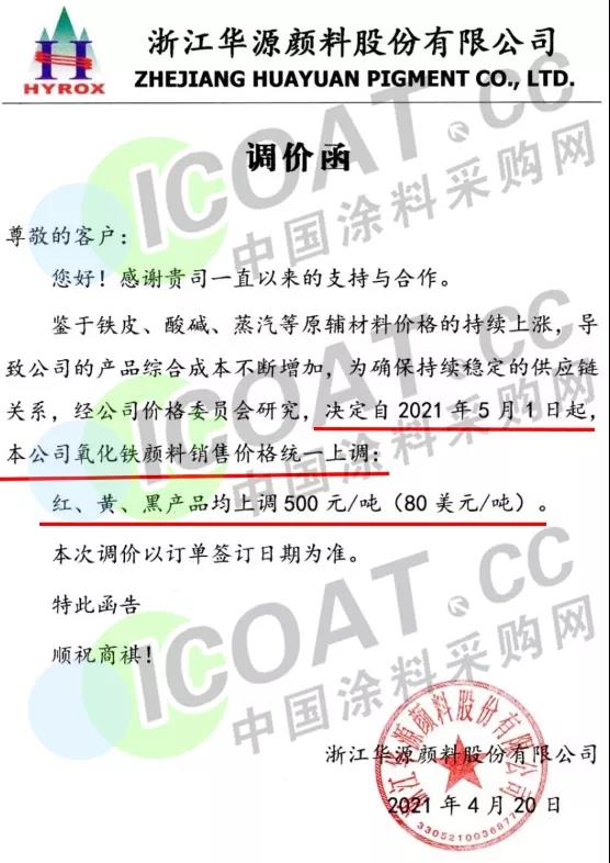 华源颜料发布调价函,决定自5月1日起,氧化铁颜料销售价格统一上调:红、黄、黑产品均上调500元/吨(80美元/吨)。
