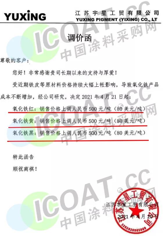 江苏宇星工贸有限公司发布调价函,称4月21日起,氧化铁红、氧化铁黄、氧化铁黑产品,销售价格上调人民币500元/吨(80美元/吨)。