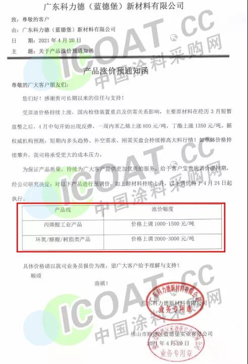 广东科力德(蓝德堡)新材料有限公司发函,称丙烯酸工业产品价格上调1000-1500元/吨,环氧/醇酸/树脂类产品价格上调2000-3000元/吨。