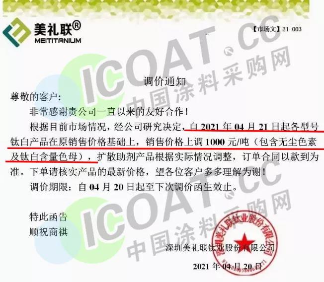 深圳美礼联钛业发函,称4月21日起各型号钛白产品在原销售价格基础上,销售价格上调1000元/吨,扩散助剂产品根据实际情况调整。