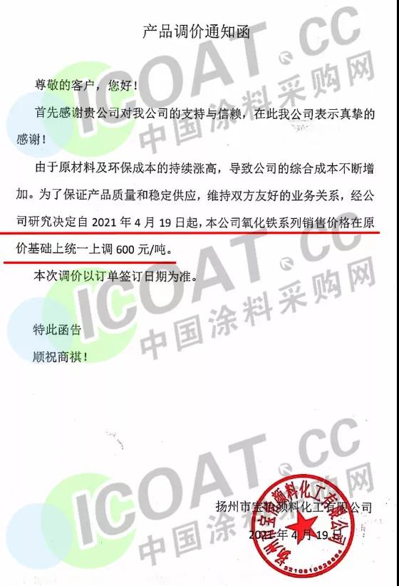 扬州市宝怡颜料化工发函,称4月19日起,氧化铁系列销售价格在原价基础上统一上调600元/吨。