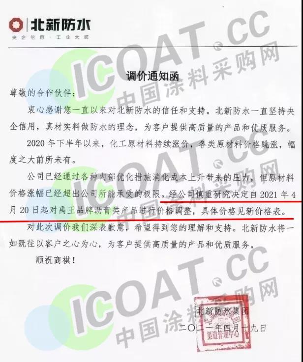 北新防水集团发函,称4月20日起,对禹王品牌沥青类产品进行价格调整,具体价格见新价格表。
