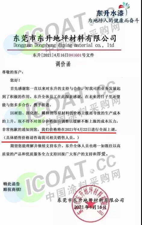 东莞市东升地坪材料发函,称产品价格在4月22日进行全面上调,具体销售价格请咨询相关销售人员。
