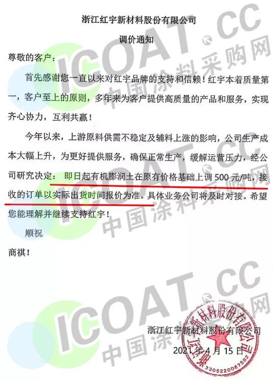 浙江红宇新材料发函,称即日(15日)起有机膨润土在原有价格基础上上调500元/吨。