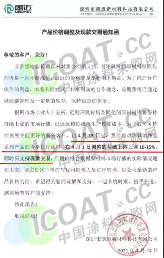 深圳市朗迈新材料发函,称4月15日起,对环氧地坪全系列产品的价格进行调整,在4月1日调整的基础上在上调10——15%,同时只支持现款交易。