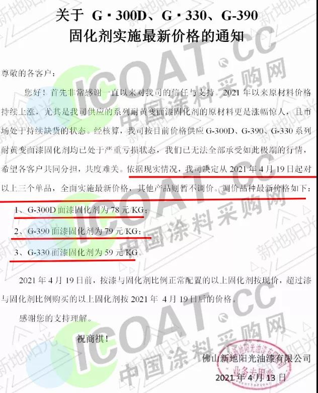 佛山新地阳光油漆发函,称4月19日起,对三个单品全面实施最新价格。