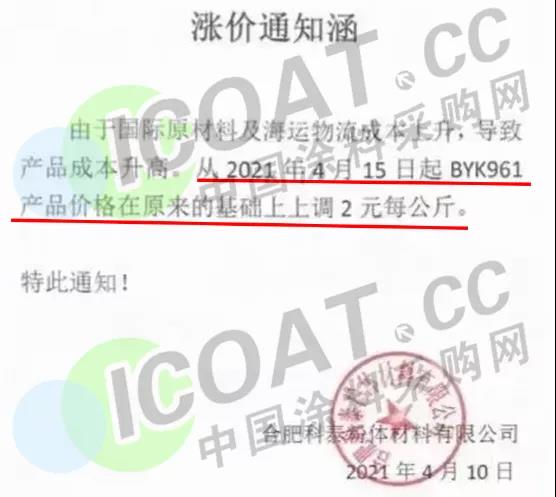 合肥科泰粉体材料发函,称4月15日起BYK961产品价格在原来的基础上上调2元/公斤(2000元/吨)。