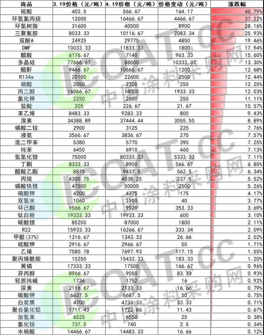 据涂料采购网了解,近期化工行业火爆异常,颜料、树脂等化工品涨势难停。多家化工企业发函宣布涨价,涉及到钛白粉、颜料、乳液等众多化工品。