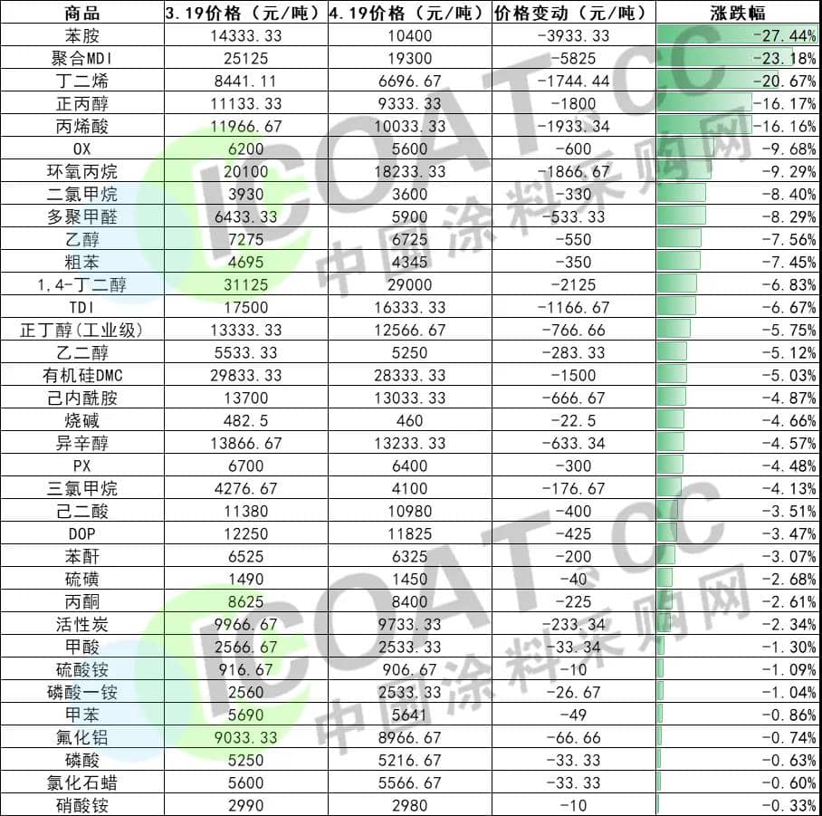 除此之外,正丙醇下跌1800元/吨,跌幅16.17%;丁二烯下跌1744.44元/吨,跌幅20.67%;有机硅下跌1500元/吨,跌幅5.03%;TDI下跌1166.67元/吨,跌幅6.67%……9种原材料价格下跌超过1000元/吨,16种原材料价格下跌超过100元/吨。