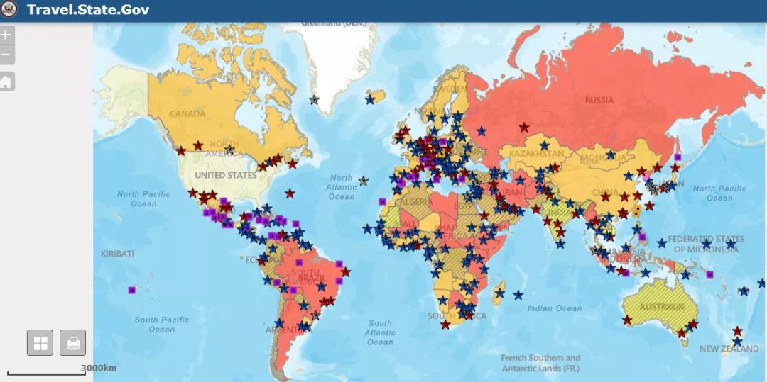美国国务院19日宣布,将开始更新旅行警告系统,使其更紧密地贴合疾病控制与预防中心(CDC)的建议。这一变化会导致最高警告级别——4级“请勿前往”的国家数量新增130个,全世界大约80%的国家都会被纳入这一范畴。