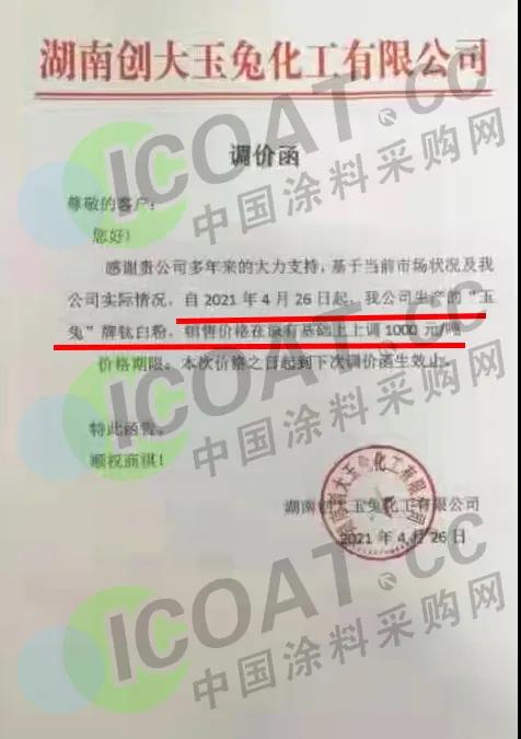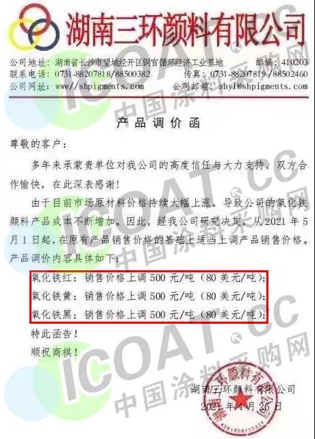 湖南三环颜料有限公司:经研究决定,从2021年5月1日起,适当上调产品销售价格。氧化铁红、氧化铁黄、氧化铁黑销售价格上调500元/吨(80美元/吨)。