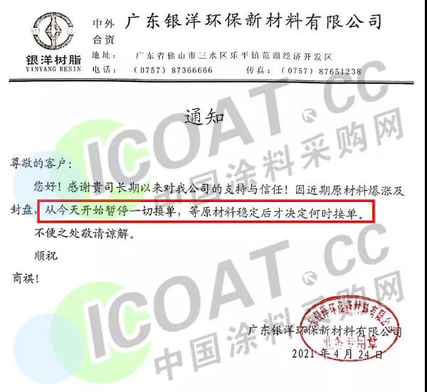而在此前,广东银洋环保新材料有限公司发函,称由于近期原材料暴涨及封盘,即日起暂停一切接单,等原材料稳定后才决定何时接单。