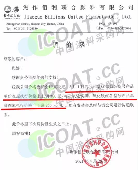 焦作佰利联合颜料有限公司:经研究决定,5月1日起氧化铁黄各型号产品单价在原执行价格上上调300元/吨,氧化铁黑、氧化铁红各型号产品单价在原执行价格上上调200元/吨。