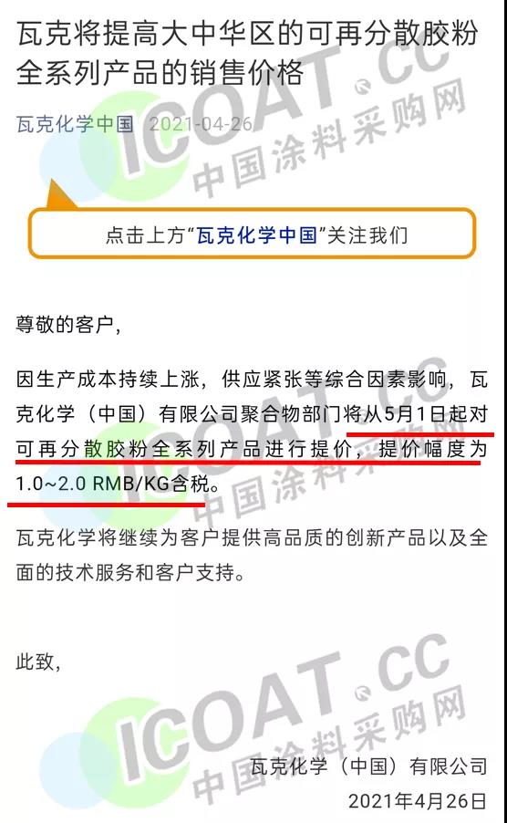 瓦克化学(中国)有限公司:聚合物部门将从5月1日起对可再分散胶粉全系列产品进行提价,提价幅度为1.0~2.0 RMB/KG(1000-2000元/吨)含税。