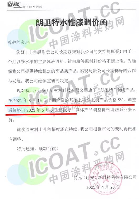 朗卫特水性漆:现对易元(迁安)新材料科技有限公司旗下“朗卫特”全线产品在2021年3月15日上调价格的基础上再次上调产品价格5%,调整后价格自2021年5月6日起执行,具体产品调整价格请联系业务人员。