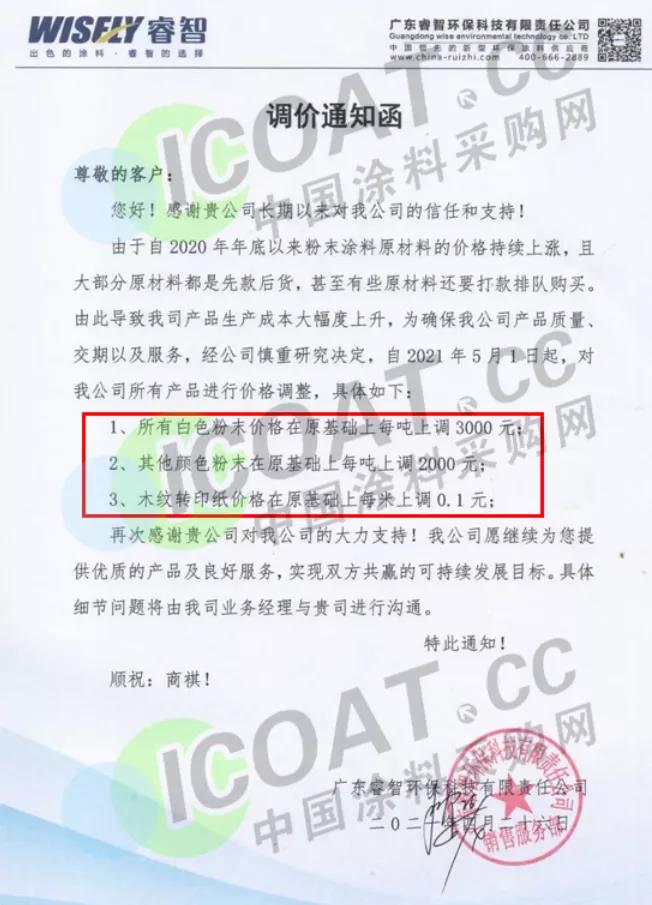 2、其他颜色粉末在原基础上上调2000元/吨。