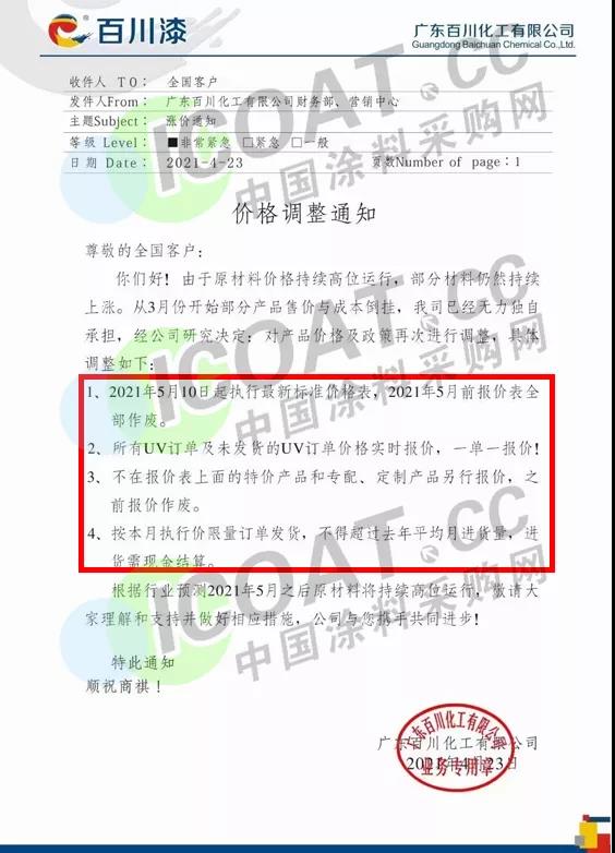 除此之外,部分涂料企业也通过客户群、微信群等通知了5月涨价情况,提醒客户根据库存合理备货,并及时支付货款。目前已经出现产品售价与成本倒挂的情况,众多企业表示无力独自承担,只能选择涨价。
