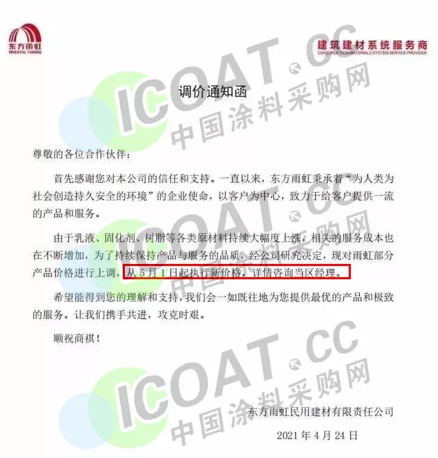 东方雨虹民用建材有限责任公司:经研究决定,对雨虹部分产品价格进行上调,从5月1日起执行新价格,详情咨询当区经理。