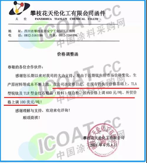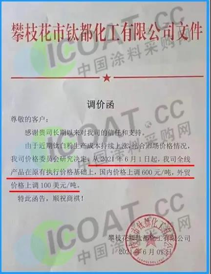 同日,攀枝花市钛都化工发布调价函称,自即日起,全线产品在原价基础上,国内价格上调600元/吨;外贸价格上涨100美元/吨。