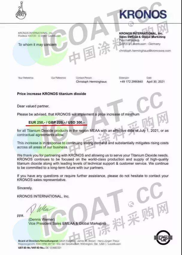 科慕:自2021年7月1日起,根据合同或法律允许,在大中华区采购的所有规格的Ti-Pure™钛白粉将增加200美元/吨(约1291元/吨)。