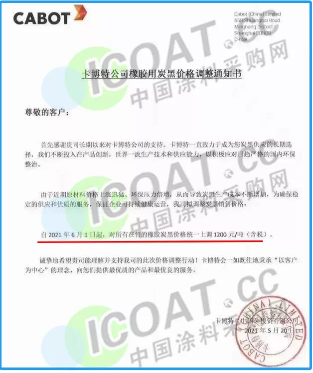 卡博特就已经宣布7月1日起或在客户合同允许的情况下,北美所有碳黑产品的价格提高0.06美元/磅(约852元/吨)。
