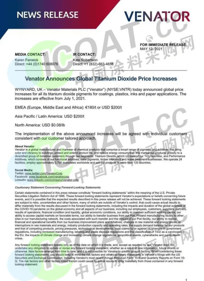 国际钛白粉龙头企业泛拓能Venato宣布,其用于涂料、塑料、油墨和纸张应用的所有二氧化钛颜料的全球价格上涨。此次上调从2021年7月1日起生效。