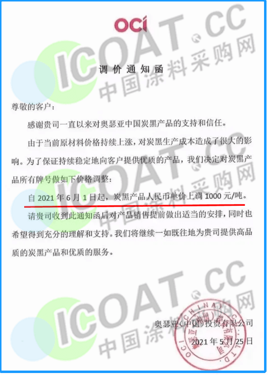 奥瑟亚(中国)投资有限公司:自2021年6月1日起,炭黑产品人民币单价上调1000元/吨。