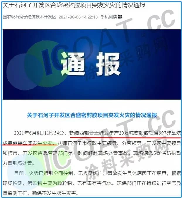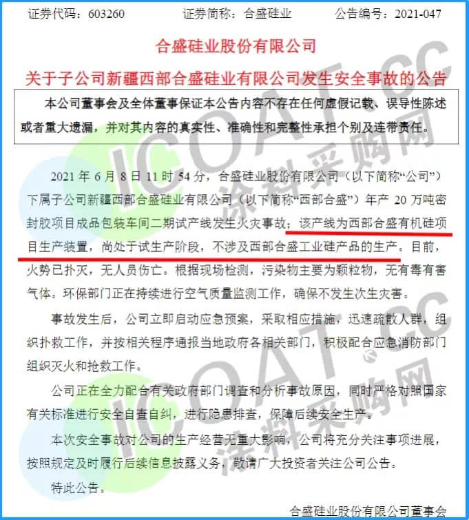 事发当日, 合盛硅业发布公告,2021年6月8日11时54分,公司下属子公司新疆西部合盛硅业有限公司(“西部合盛”)年产20万吨密封胶项目成品包装车间二期试产线发生火灾事故;该产线为西部合盛有机硅项目生产装置,尚处于试生产阶段,不涉及西部合盛工业硅产品的生产。