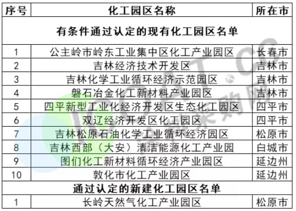 吉林省人民政府办公厅印发《吉林省化工园区认定管理办法(试行) 》,并且化工园区认定结果已完成公示,其中,有条件通过认定的现有化工园区10家,通过认定的新建化工园区1家,未通过认定的现有化工园区9家。化工园区数量较此前增加6个。