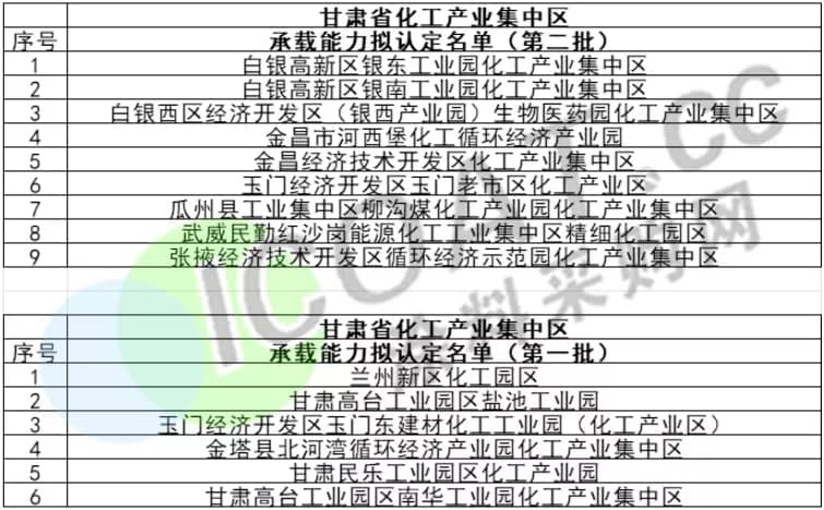 甘肃省工业和信息化厅网站公示第一批甘肃省化工产业集中区承载能力认定名单,共6家;甘肃省工信厅在官网公示了第二批甘肃省化工产业集中区承载能力认定名单,共收录有9家园区或集中区,目前甘肃获得认定的化工产业集中区将达到15家。化工园区数量较此前没有变化。