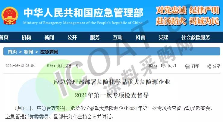 与此同时,15日应急管理部发布信息,称为防控危化品重大安全风险,以及为庆祝建党100周年营造安全稳定环境,应急管理部派出6个工作组,赴北京、天津、河北、山东、江苏等14个重点省份开展危化品重大危险源企业专项督导核查。