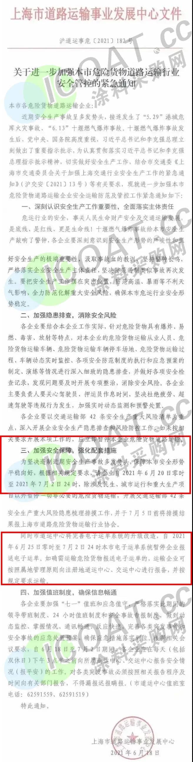 上海市道路运输事业发展中心发布《关于进一步加强本市危险货物道路运输行业安全管控的紧急通知》表示,自2021年6月20日零时至2021年7月2日23时,除涉及民生、城市运行和重大生产项目以外暂停一切非必要的危险货物运输,开展交通运输部42条安全生产重大风险隐患梳理摸排工作,并于7月5日前将摸排结果报上海市道路危险货物运输行业协会。