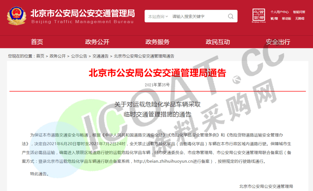 北京市公安局公安交通管理局通告:决定自2021年6月20日零时至2021年7月2日24时,全天禁止运载危险化学品(含剧毒化学品)车辆在本市行政区域内道路行驶。