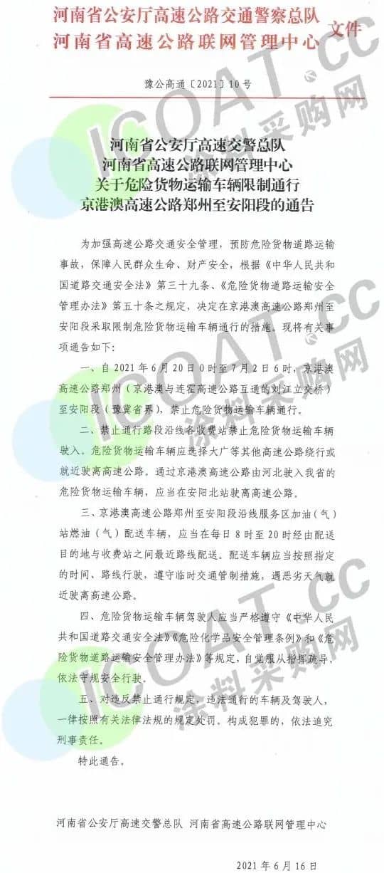 河南省公安厅高速交警总队、河南省高速公路联网管理中心发布关于危险货物运输车辆限制通行京港澳高速公路郑州至安阳段的通告。自2021年6月20日0时至7月2日6时,京港澳高速公路郑州(京港澳与连霍高速公路互通的刘江立交桥)至安阳段(豫冀省界),禁止危险货物运输车辆通行。禁止通行路段沿线各收费站禁止危险货物运输车辆驶入。