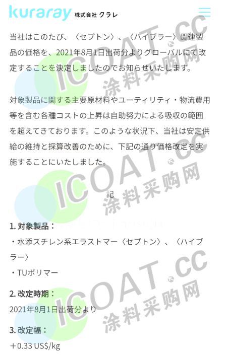 可乐丽:8月1日起,在全球范围内上调公司所有等级的SEPTON™、HYBRAR™氢化苯乙烯类弹性体和TU聚合物的售价,上涨0.33美元/磅(约2138元/吨)。