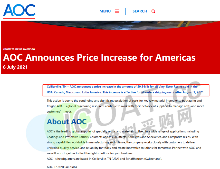 AOC(力联思):8月1日起,所有等级乙烯基酯树脂在美洲地区的价格将提高0.14美元/磅(约1985元/吨)。