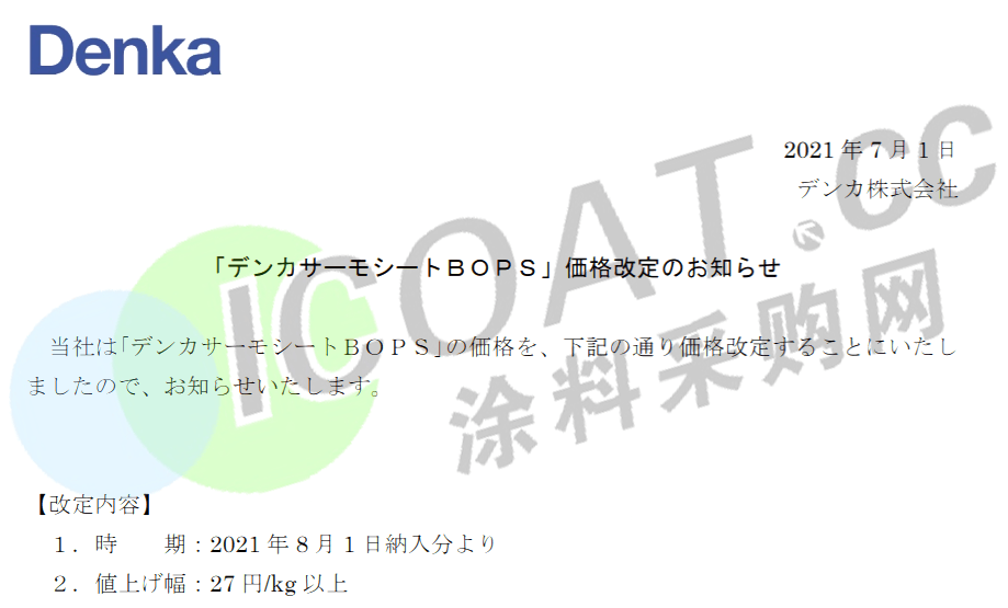 DENKA:因聚苯乙烯等原材料价格上涨导致成本增加,公司决定8月1日起对部分聚苯乙烯产品价格上调27日元/千克(约1572元/吨)。