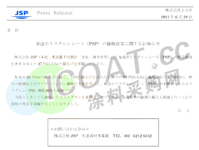 JSP株式会社:8月1日起,将发泡聚苯乙烯片材(PSP)的售价提高27日元/千克(约1576元/吨)以上。