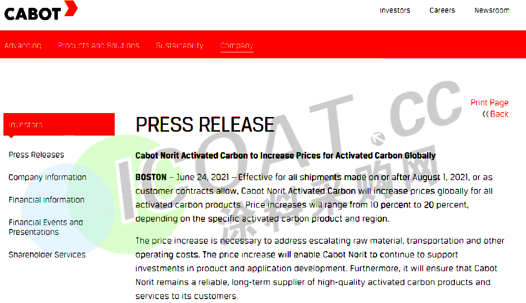 卡博特:8月1日起,卡博特诺芮特活性炭公司将在全球范围内提高所有活性炭产品的价格,涨幅在10%-20%之间。