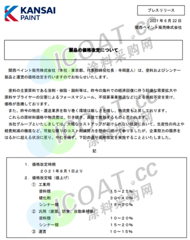 关西涂料株式会社:8月1日起,工业用涂料类上调15-25%,固化剂30-40%,稀释剂15-20%;通用(建筑、防蚀、汽车维修)涂料类上调10-20%,稀释剂上调15-20%;运费上调10%-15%。