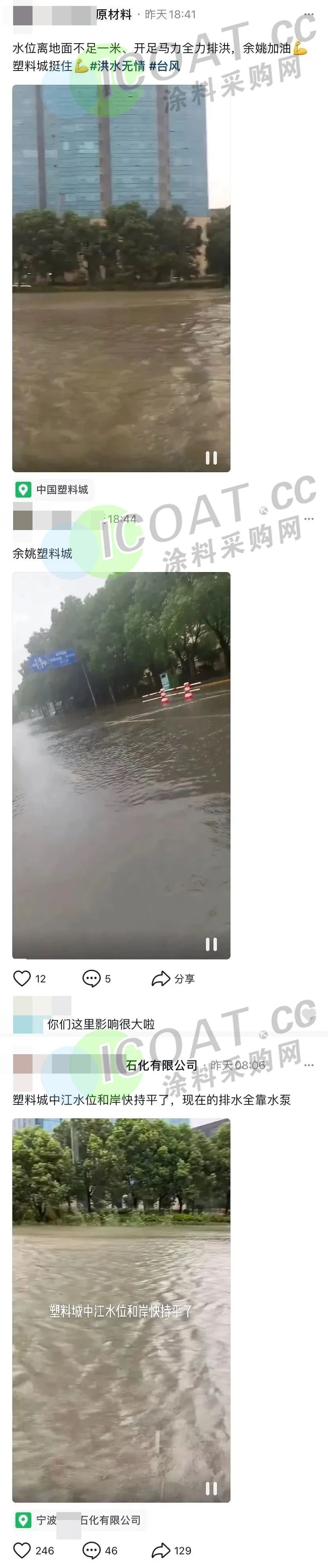 据宁波市水利局发布,22日8时至27日8时,全市面平均雨量为379毫米,降雨主要集中在北部,其中面雨量最大余姚市539毫米。目前下姚江水位已超过堤防的警戒和保证水位,且水位呈快速上涨趋势,受此影响,余姚5个村全体撤离!位于浙江余姚附近的中国塑料城内,多家企业被水淹,雨水倒灌进店铺,已有工厂发布了暂停发货通知。