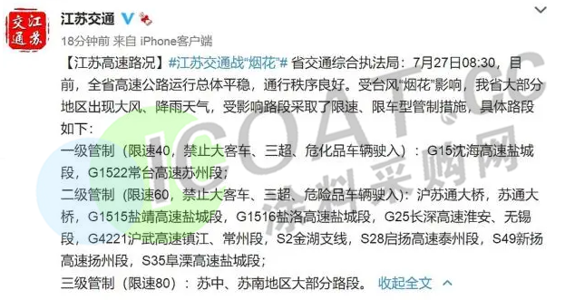 江苏省大部分地区出现大风、降雨天气,受影响路段采取了限速、限车型管制措施,具体路段如下: