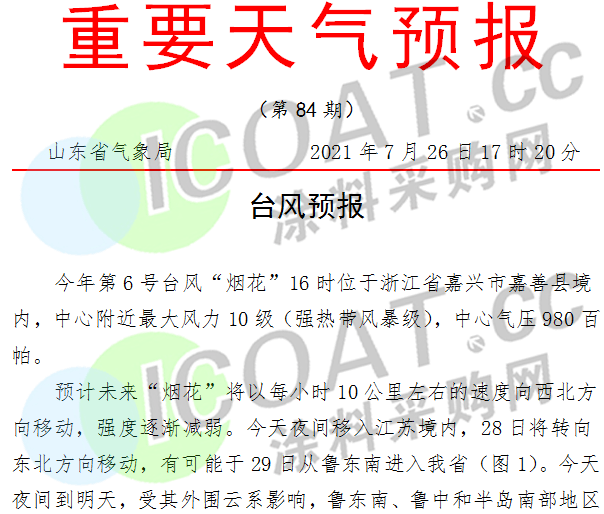 据省气象台预测,预计未来“烟花”将以每小时10公里左右的速度向西北方向移动,28~30日,山东省大部地区有暴雨局部大暴雨或特大暴雨。